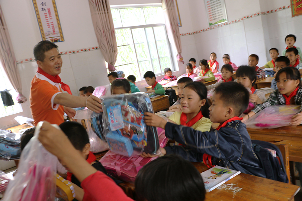在同社村小學校長的帶領下,我們的愛心小組參觀了孩子們的教室和宿舍,校長說這里很多孩子每天要走路最少一、兩個小時來上課,條件很艱苦,但孩子們學習的積極性很高,也非常懂事。看著孩子們的住宿環境,我們心里有說不出的滋味。當我們拿出為孩子們準備的新書包時,孩子們的眼里有光,詹總親自給每一位孩子送上新書包,孩子們露出了純真的笑臉。